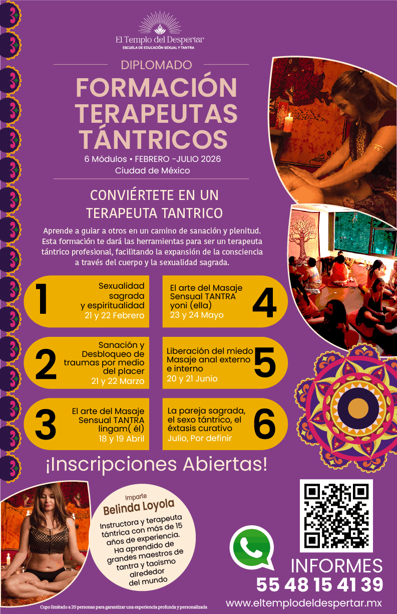 El diplomado consta de 6 módulos con temas y prácticas seleccionadas para una comprensión integral del trabajo tántrico desde una perspectiva profesional y respetuosa.